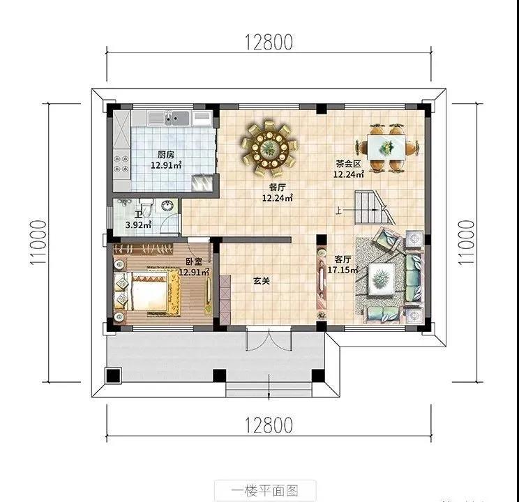 别墅一层设有玄关,客厅,餐厅,厨房,茶会区,卧室,卫生间。