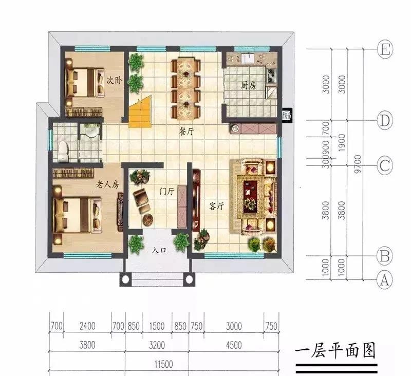 一层设入口、门厅、客厅、餐厅、厨房、卫生间、2卧室。