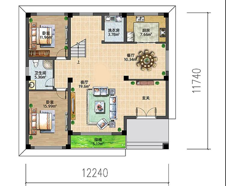 别墅一层设有玄关,客厅,餐厅,厨房,两个卧室,洗衣房,卫生间。