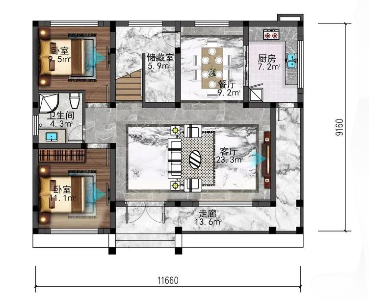一层布局设计两室两厅一厨一卫。