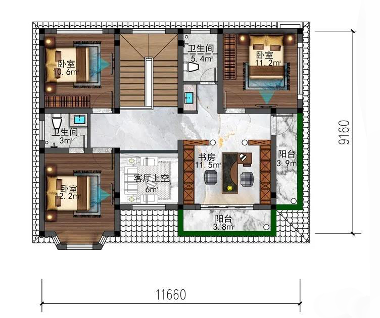 二层布局设计三室两卫带书房和阳台