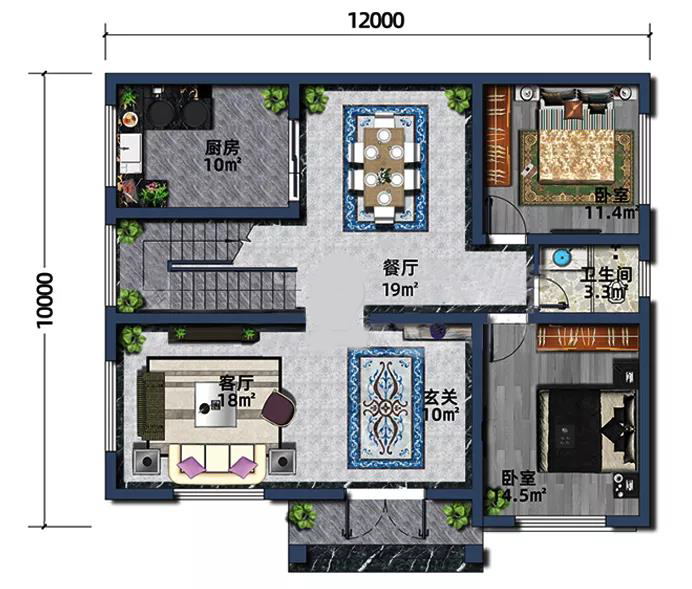 一层:设有玄关,客厅,餐厅,厨房,两个卧室,卫生间。