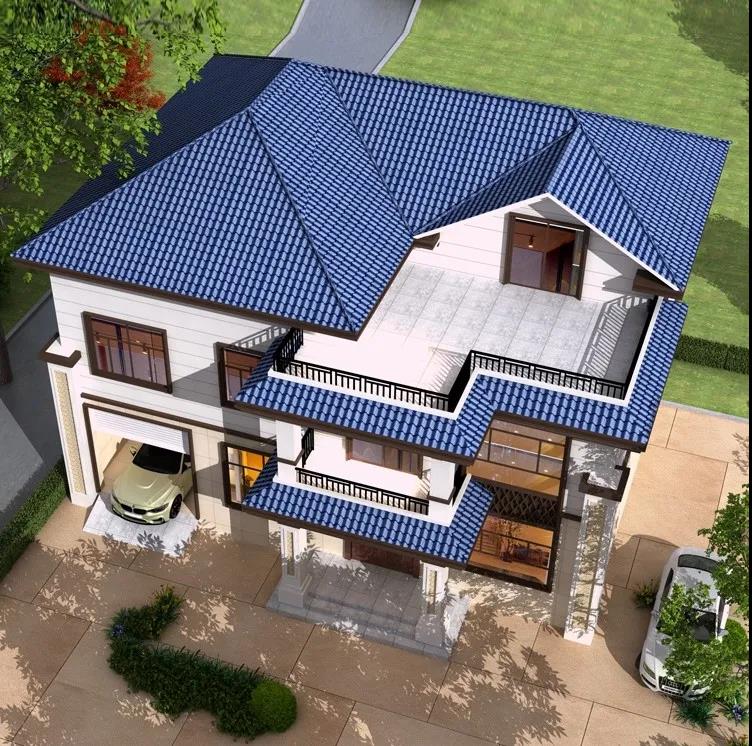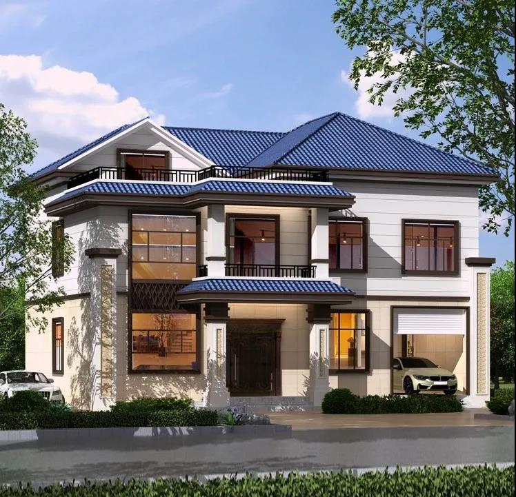 别墅介绍:整体配色清新时尚,米白色外墙搭配海蓝色的砖瓦,黑色门窗和围栏的点缀恰到好处,作为结婚的婚房不错吧。