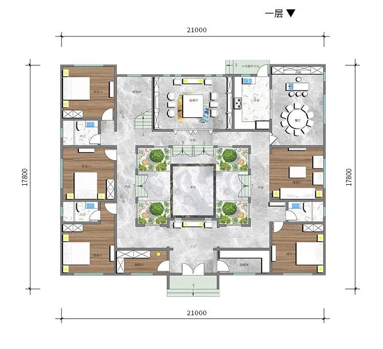 一层:会客厅,卧室(4),卫生间,厨房餐厅,客厅门厅,休闲厅。