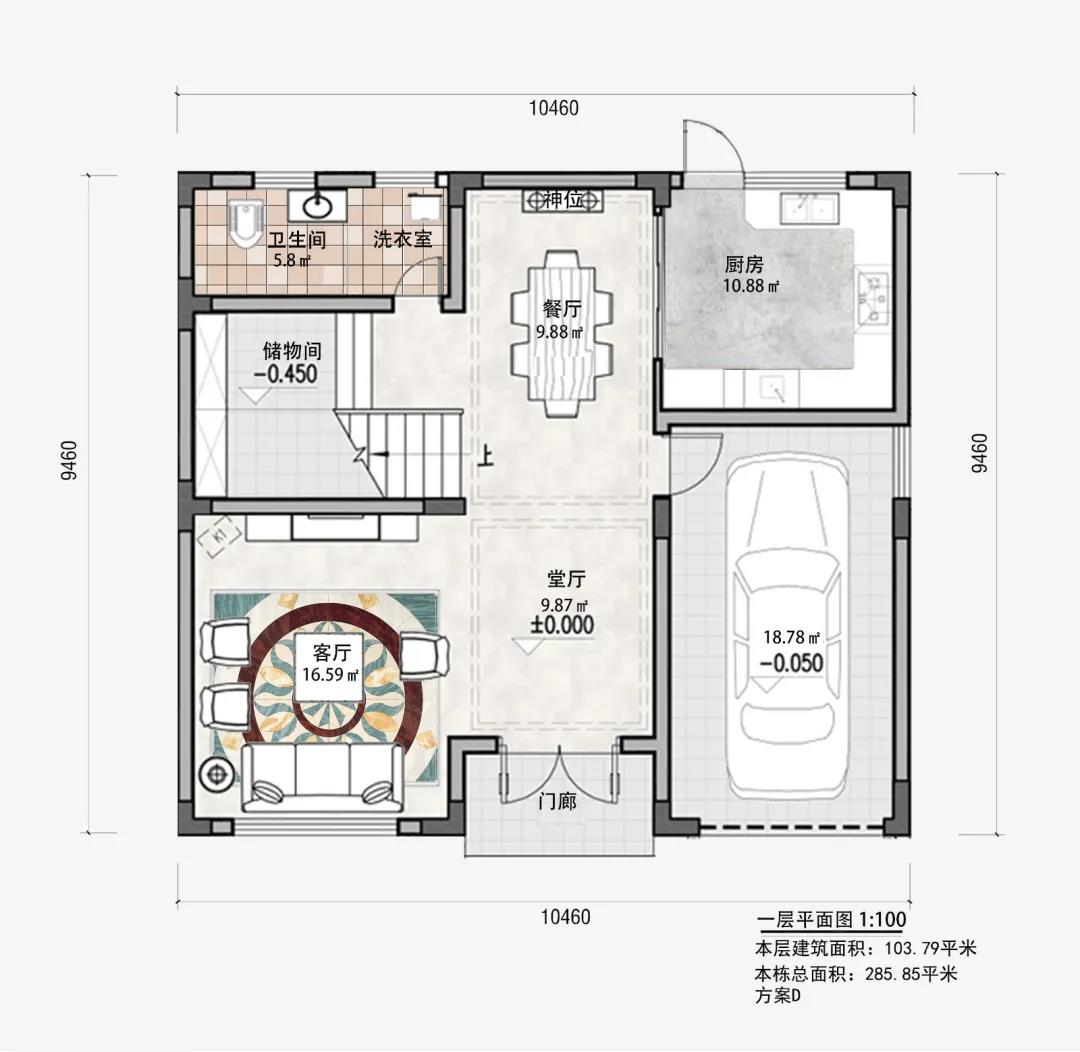 一层布局:车库、客厅、餐厅、厨房、储物间、卫生间、洗衣室