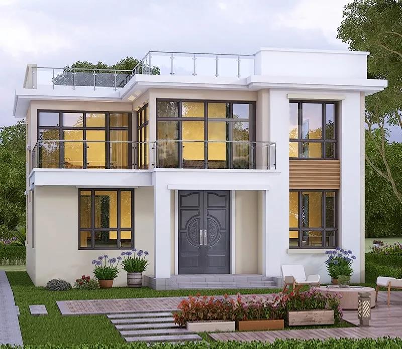 现代别墅没有复杂的外观,整体给人一种未来感,配色简单时尚,也有一种艺术气息;深受年轻人的喜爱。今天推荐的别墅是="://www.lemeizhai.com/search.asp?SearchType=Software&imageField.x=43&imageField.y=26&SearchKey=%CF%D6%B4%FA" target="_self">二层现代别墅设计,整体配色有浅色系,纯白、浅黄等等。深灰色的大门与深色窗框装饰让别墅显得更加漂亮,而且预估造价不超过40万