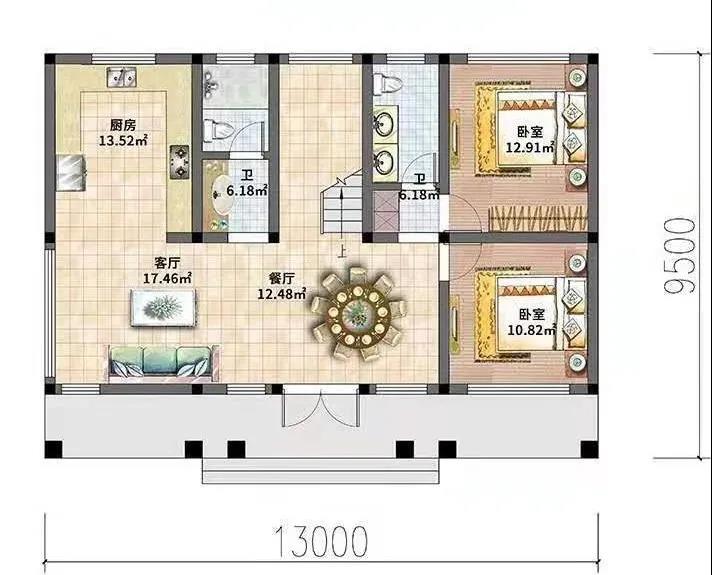 别墅一层设有客厅,餐厅,厨房,两个卧室,两个卫生间。