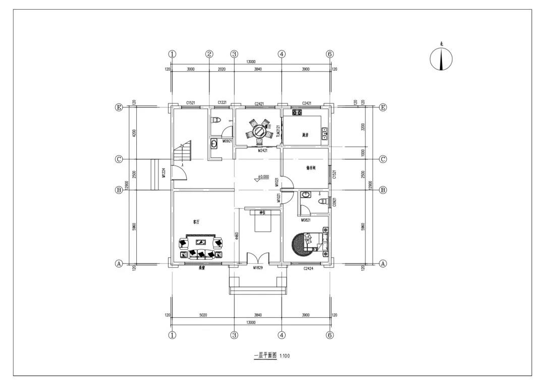 一层平面图:客厅、餐厅、厨房、2卧室、2卫生间。
