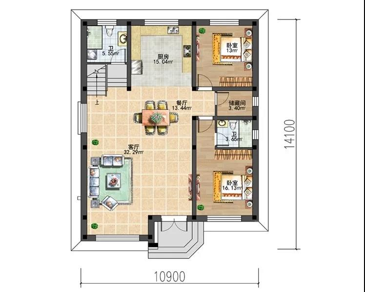 别墅一层设有客厅,餐厅,厨房,两个卧室,两个卫生间,储藏间。
