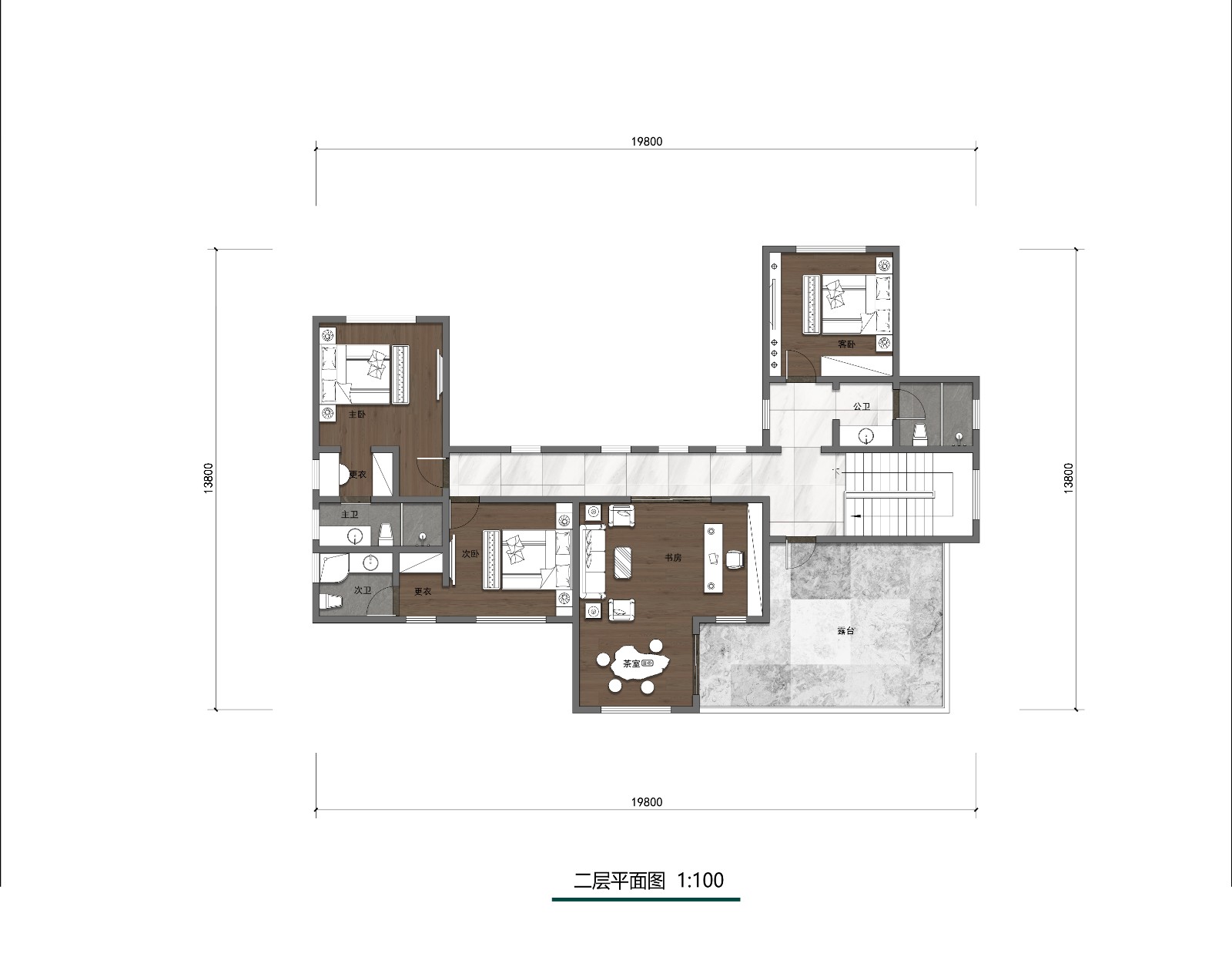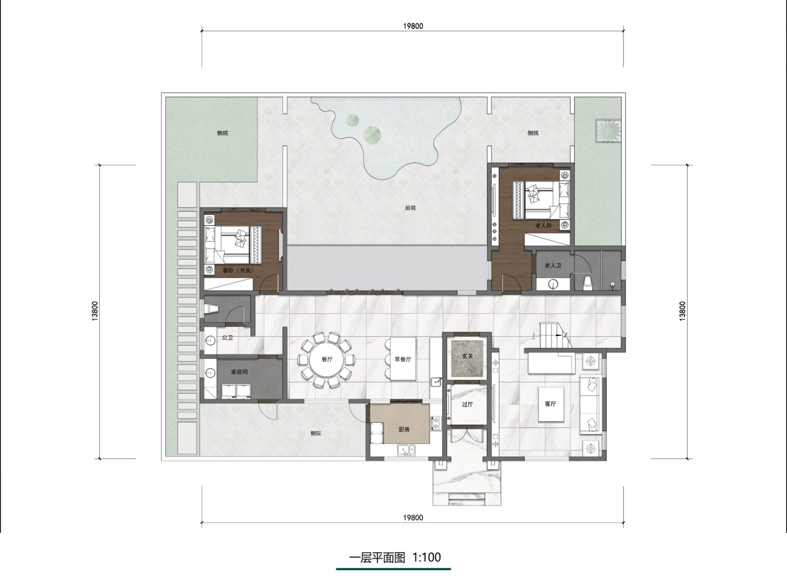 主体布置如下:后庭院、过厅、 客厅、厨房、餐厅、主卧 、厕所、杂物间、露台、书房、茶室。