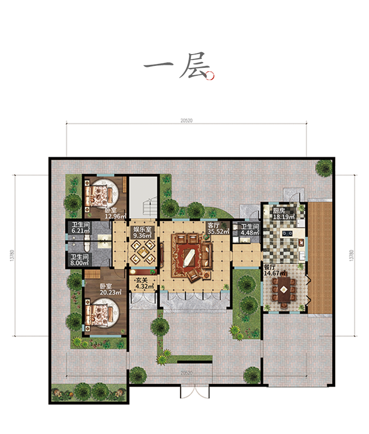 主体布置如下:玄关、 客厅、厨房、餐厅、主卧 、厕所、露台、书房、娱乐室。