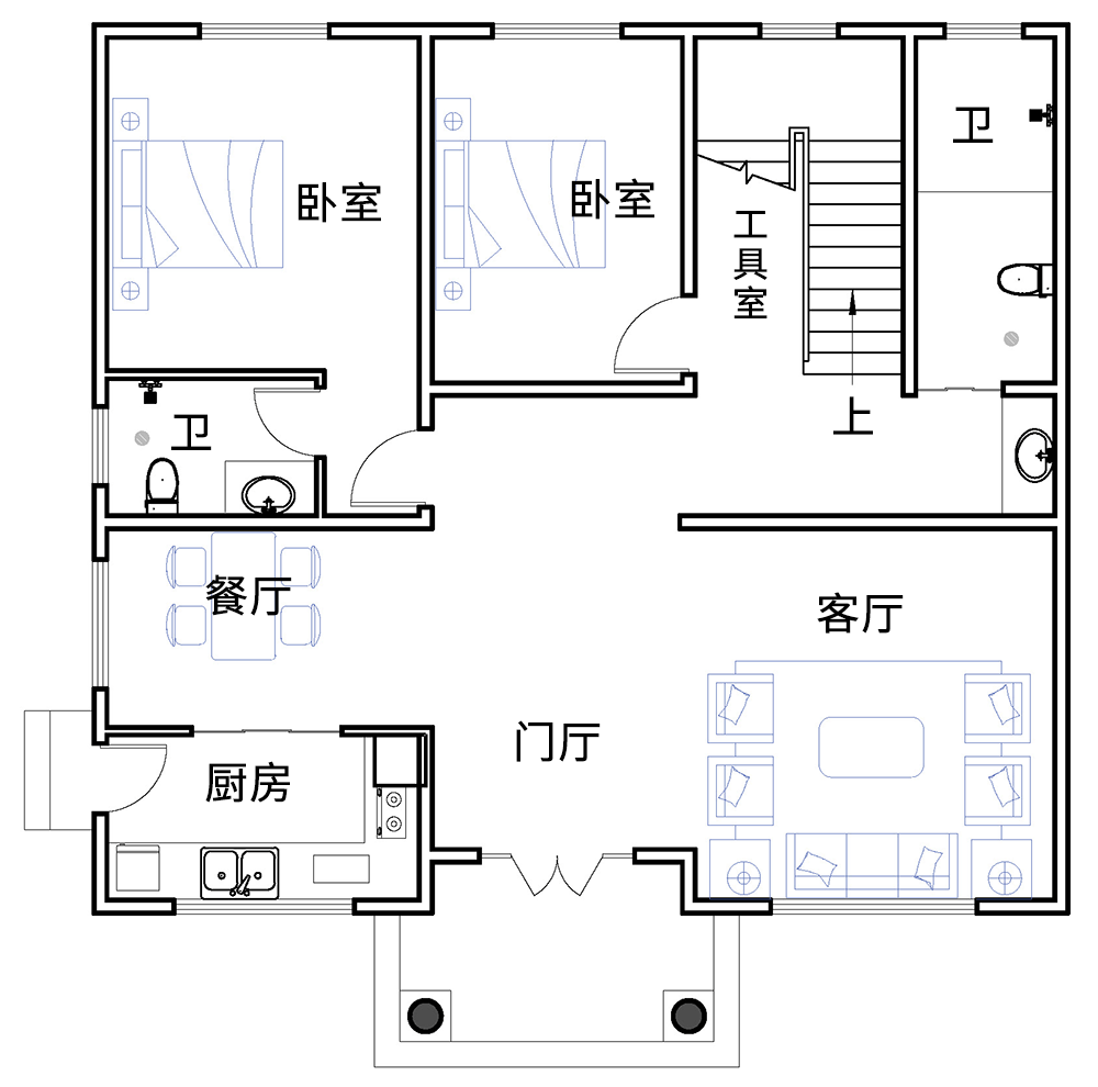 主体布置如下:玄关、客厅、餐厅、厨房、卫生间、卧室、露台。