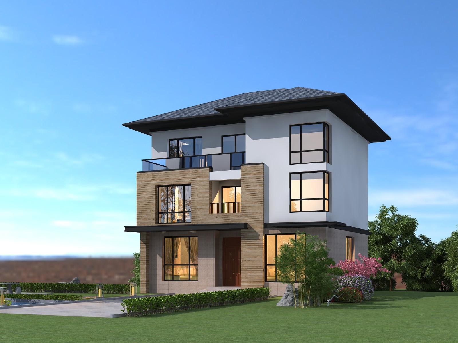 今天给大家推荐一款非常适合在农村建造的现代别墅设计,这款="://www.lemeizhai.com/Picture.asp?PicClassID=91" target="_self">三层别墅设计主体造价预估最高50万。别墅的的造型非常现代,外贴瓷砖搭配木质结构与真石漆,别墅看起来非常舒适,在农村建一栋这样的别墅别提多风光了!