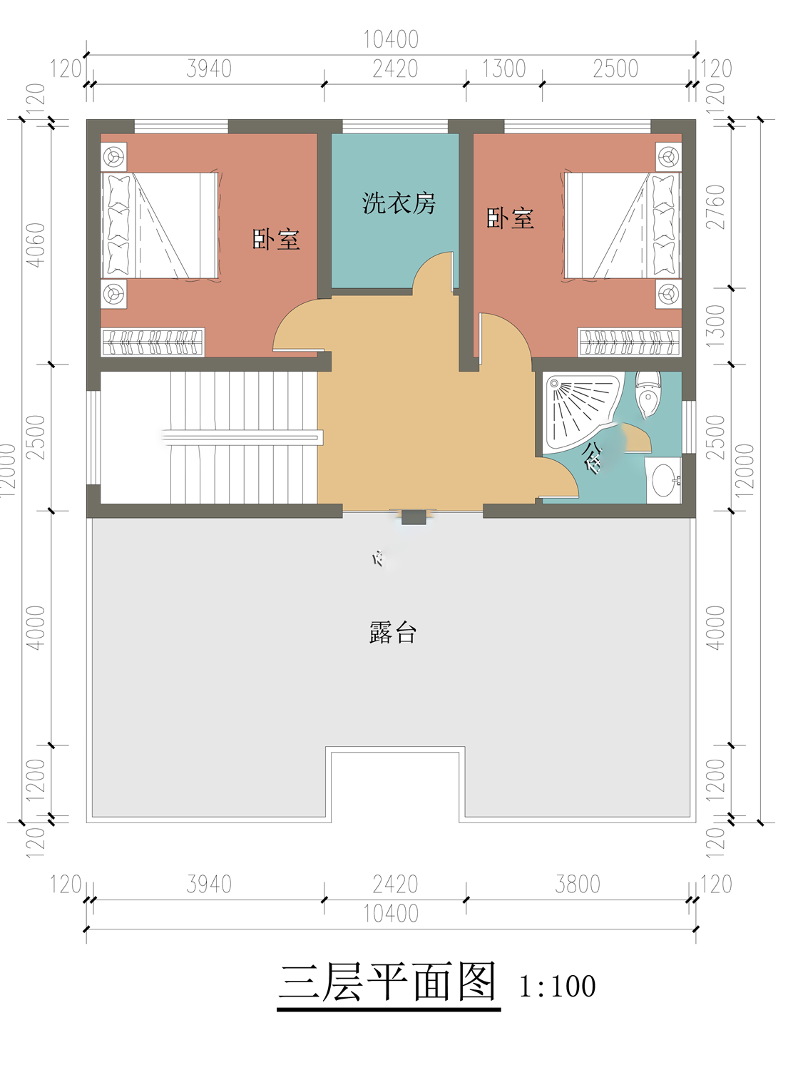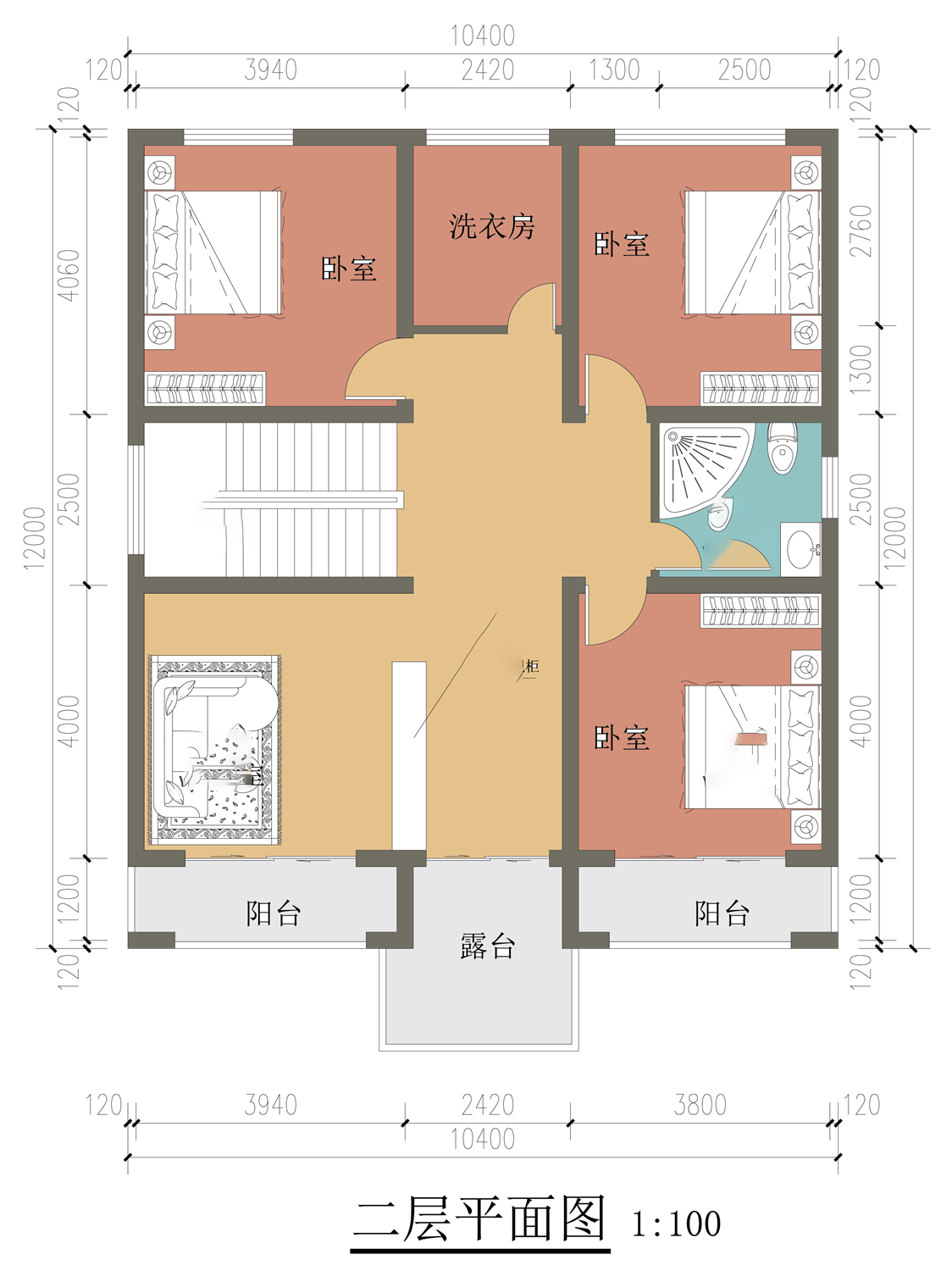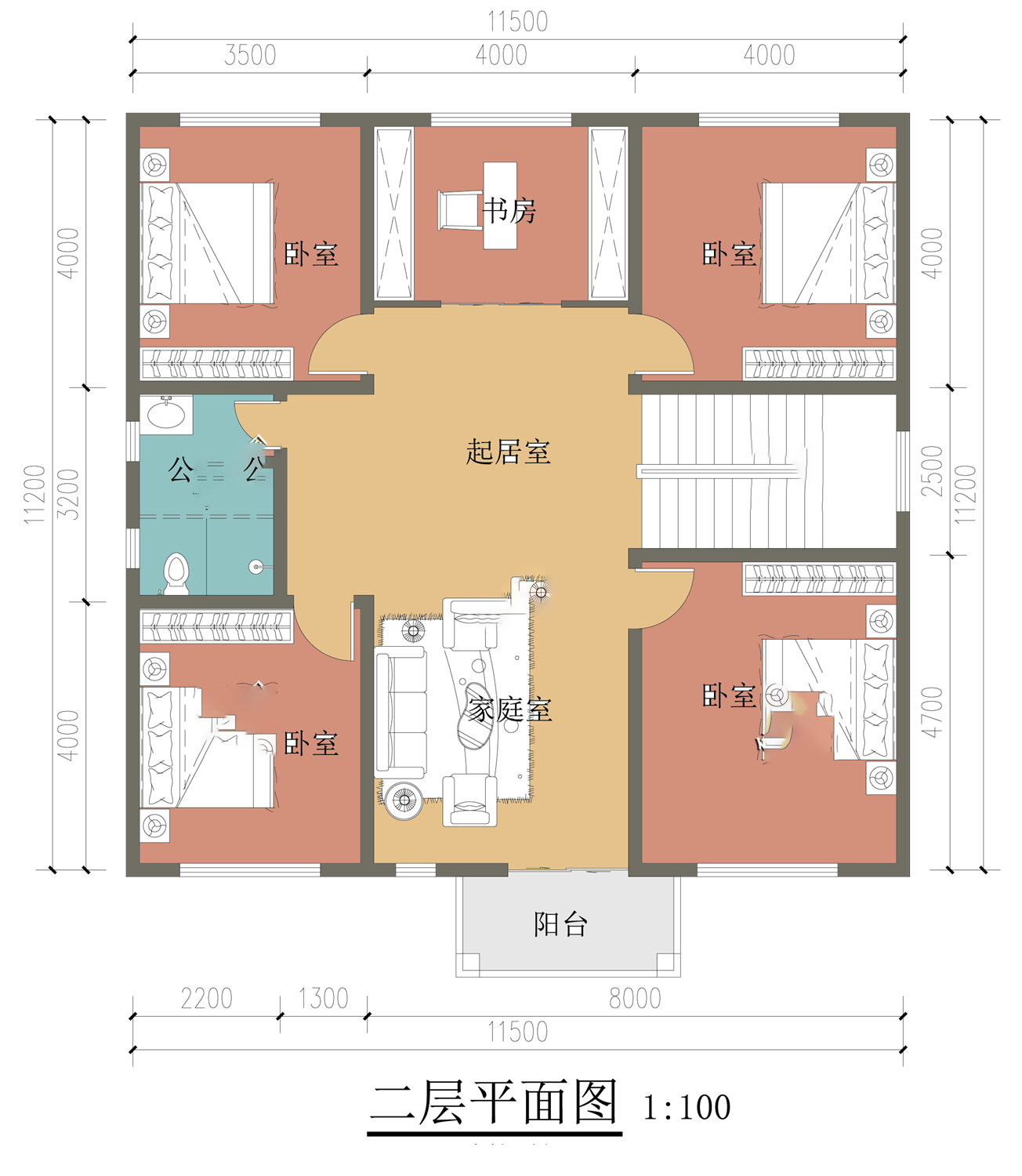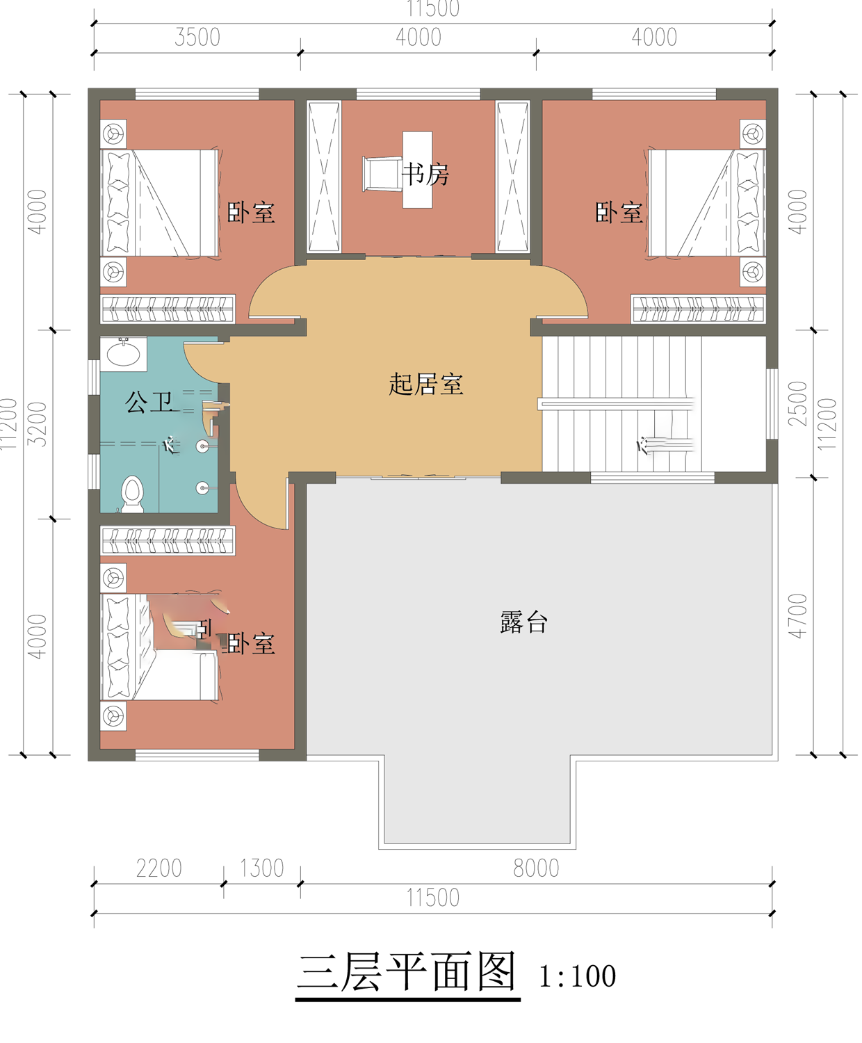 二层和三层都是为了满足一家人的居住需求,全部设置成卧室,同时还搭配了两间书房方便在此工作或者是读书学习而不受到外界的打扰。三层的超大露台不仅方便一家人的日常晾晒的需求还可以眺望远方,期待游子的归来。