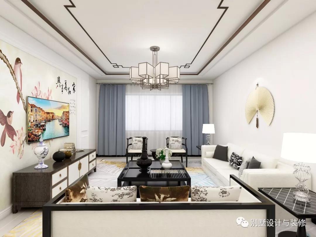 一层客厅:山水花鸟画的电视背景墙与古朴素雅的墙面挂饰,营造出浓浓的中式韵味。