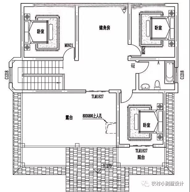 三 层:健身房、卧室x3、卫生间、大露台、阳台;