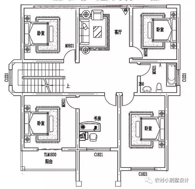 二 层:客厅、卧室(带书房)、卧室x3、卫生间、阳台;