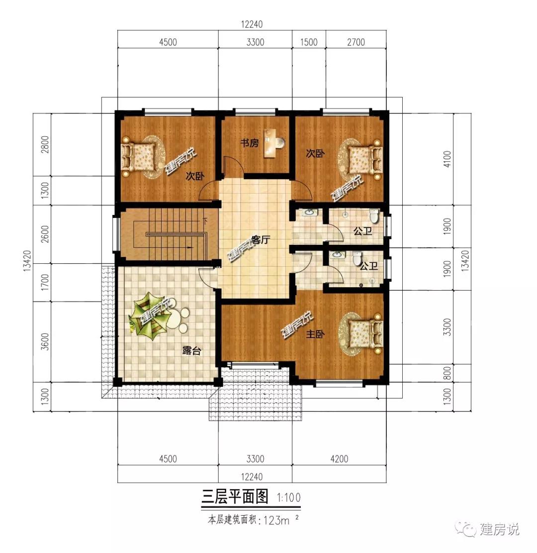 三层:功能区设置基本和二层一致,设有3个卧室、1个书房与客厅;露台便于衣物、农作物的晾晒。果然内在非常好真是一栋才貌双全的好别墅啊!