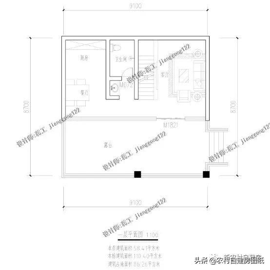 设计尺寸:开间9.1米,进深8.7米,占地面积86.26平方米,建筑面积110.4平方米。喜欢现代风又喜欢小户型设计的,这款精致小巧的现代风绝对不容错过。