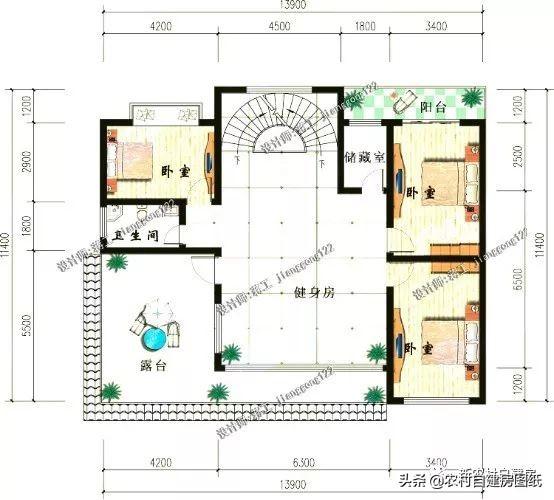 室内布局:厨房餐厅采用一体化设计,优化空间使用率。旋转楼梯大气别致,卧室按功能分别配有独立卫生间和书房、衣帽间,三层的健身房设计让农村生活更加健康自律。