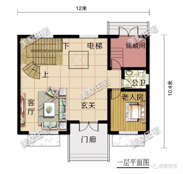 一层设玄关、客厅、储藏间、老人房、一间公卫。