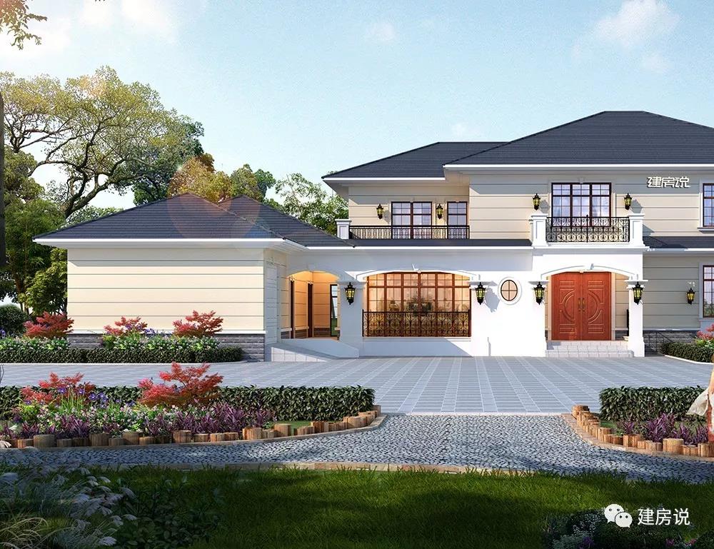 别墅外墙主体以米白色真石漆装饰,屋顶是蓝色坡屋顶,运用壁灯等欧式装饰配件点缀墙面。