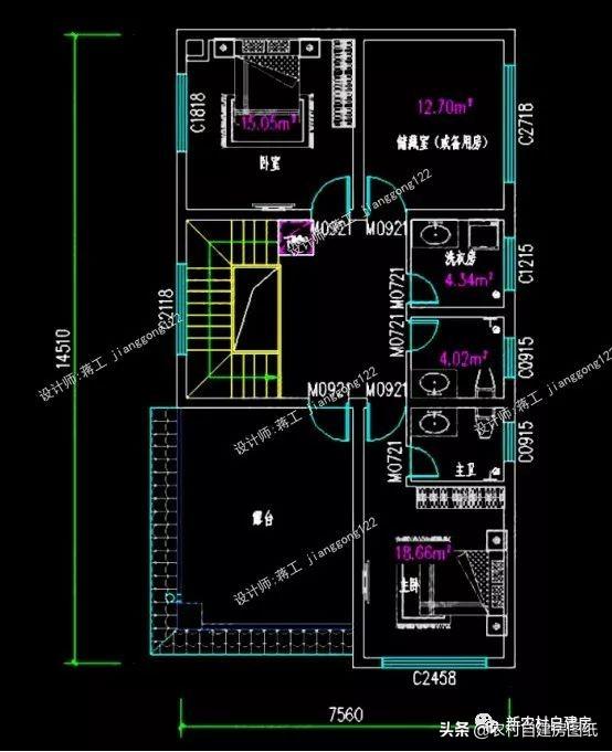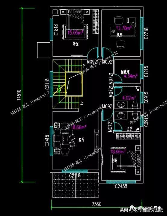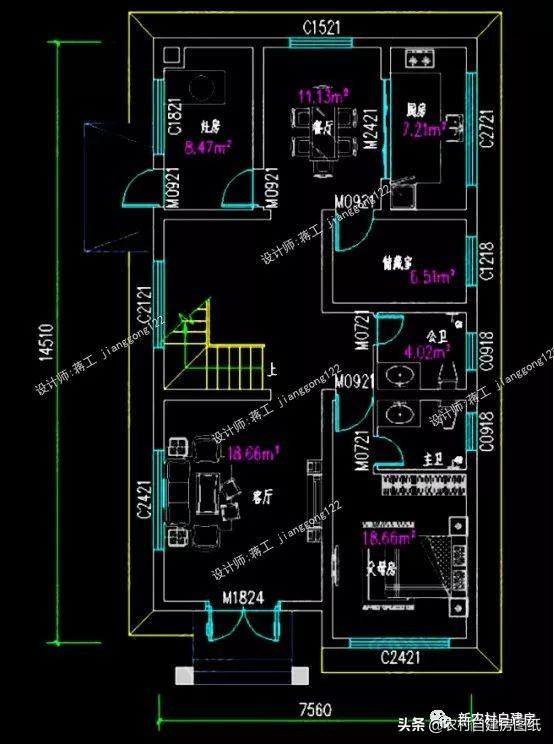 开间7.56米,进深14.51米,典型的开间小进深大户型,所以整栋建筑的四面都设计了窗户,方便室内通风透气。进门可以看到客厅和餐厅相连,整体空间的纵深感加强,厨房厨房还有传统的灶房。二楼不仅有居住、宴客功能,还有收纳空能,洗衣房设计在了三层,方便就近在露台晾晒,这样的多功能布局堪称霸气。