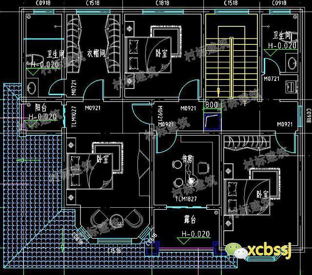 二层设计图:二层设有三间卧室,一间书房和一间衣帽间。几乎每间卧室都带有阳台。别墅布局较为紧凑。